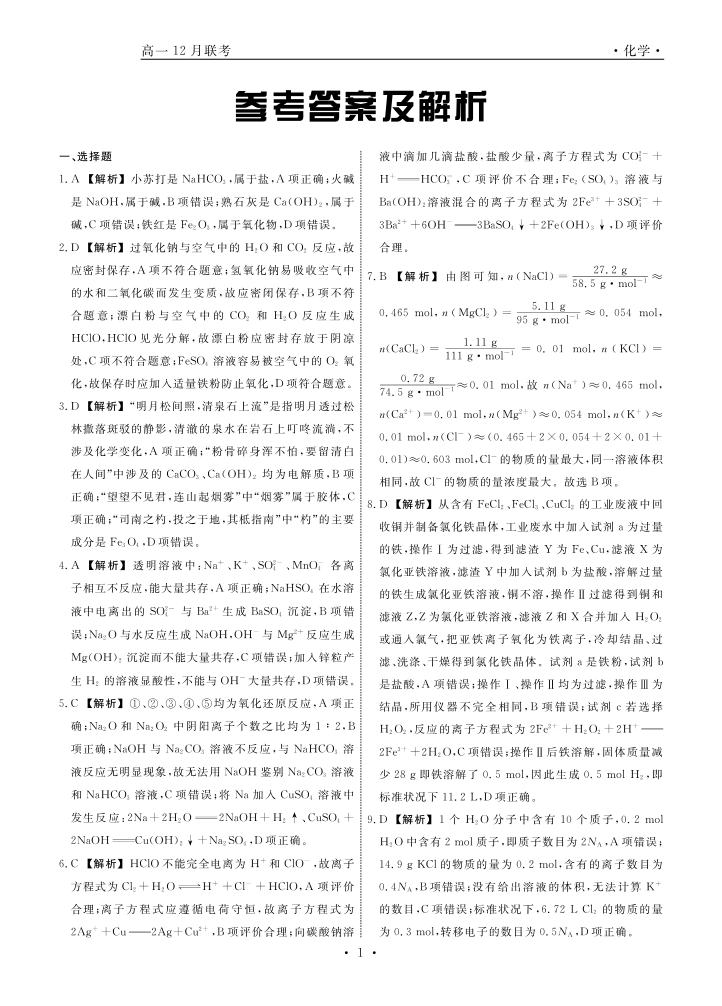 辽宁省名校联盟普通高中2024-2025学年高一12月月考化学答案