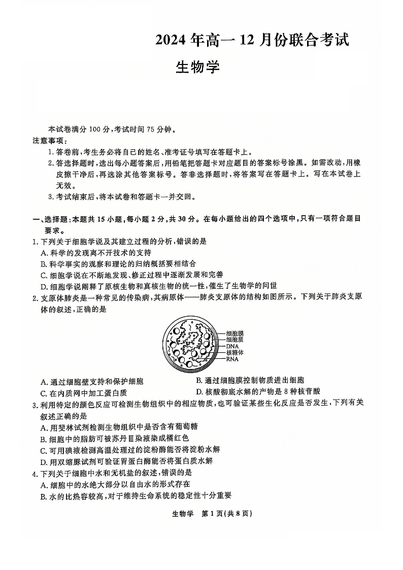 辽宁省名校联盟普通高中2024-2025学年高一12月月考生物