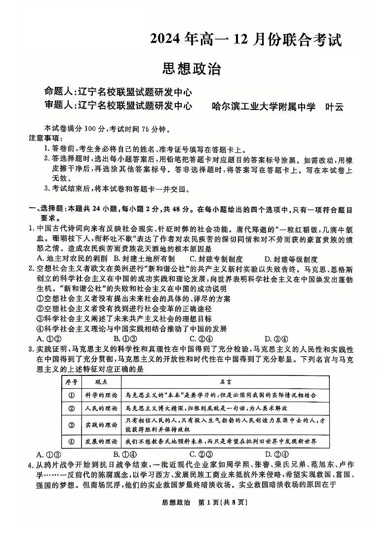 辽宁省名校联盟普通高中2024-2025学年高一12月月考政治