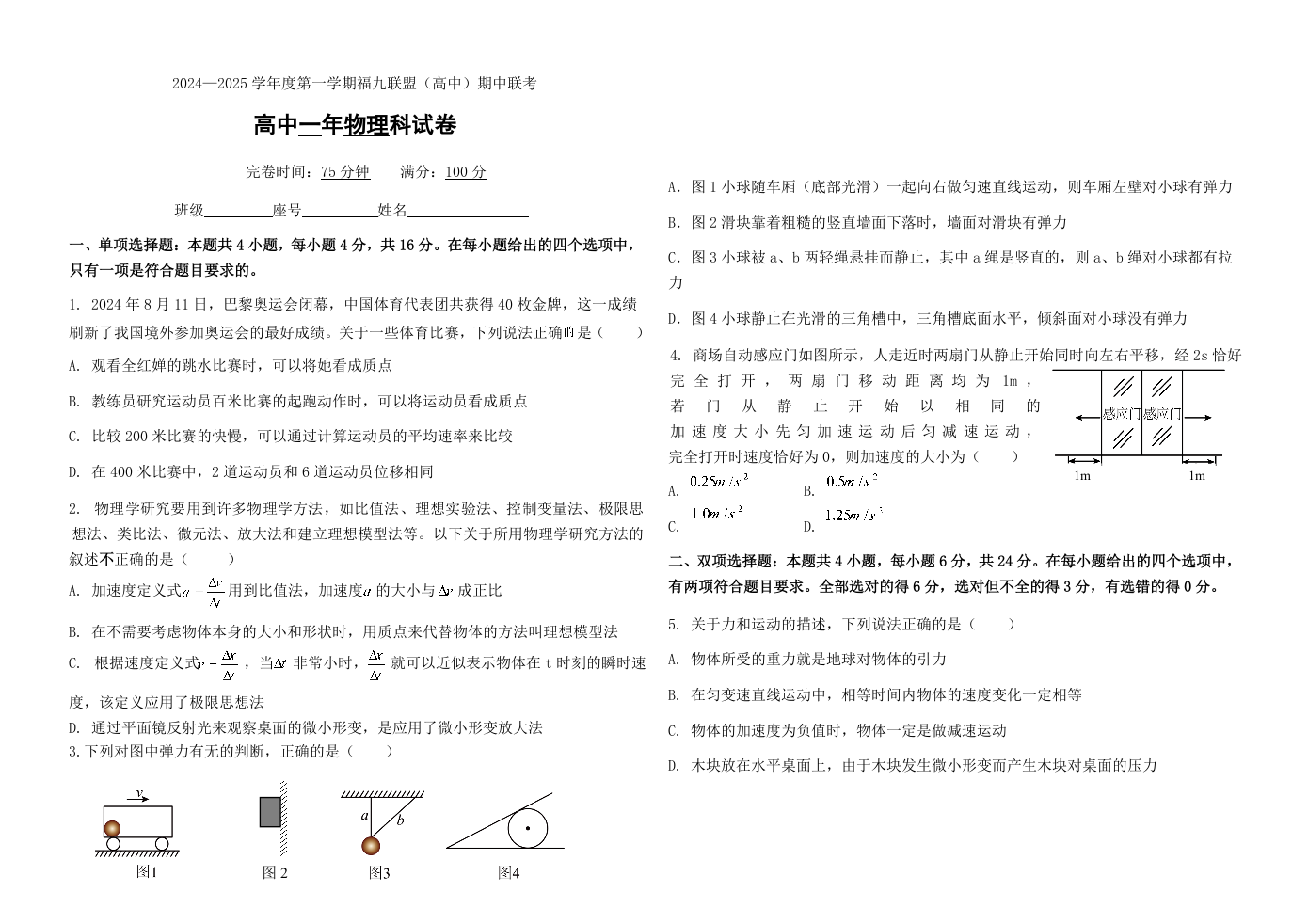 福建省福州市福九联盟2024-2025学年高一上学期期11月中联考物理Word版含答案