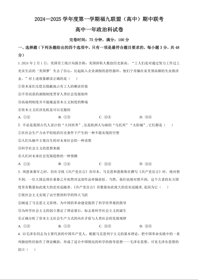 福建省福州市福九联盟2024-2025学年高一上学期期11月中联考政治(原卷版)