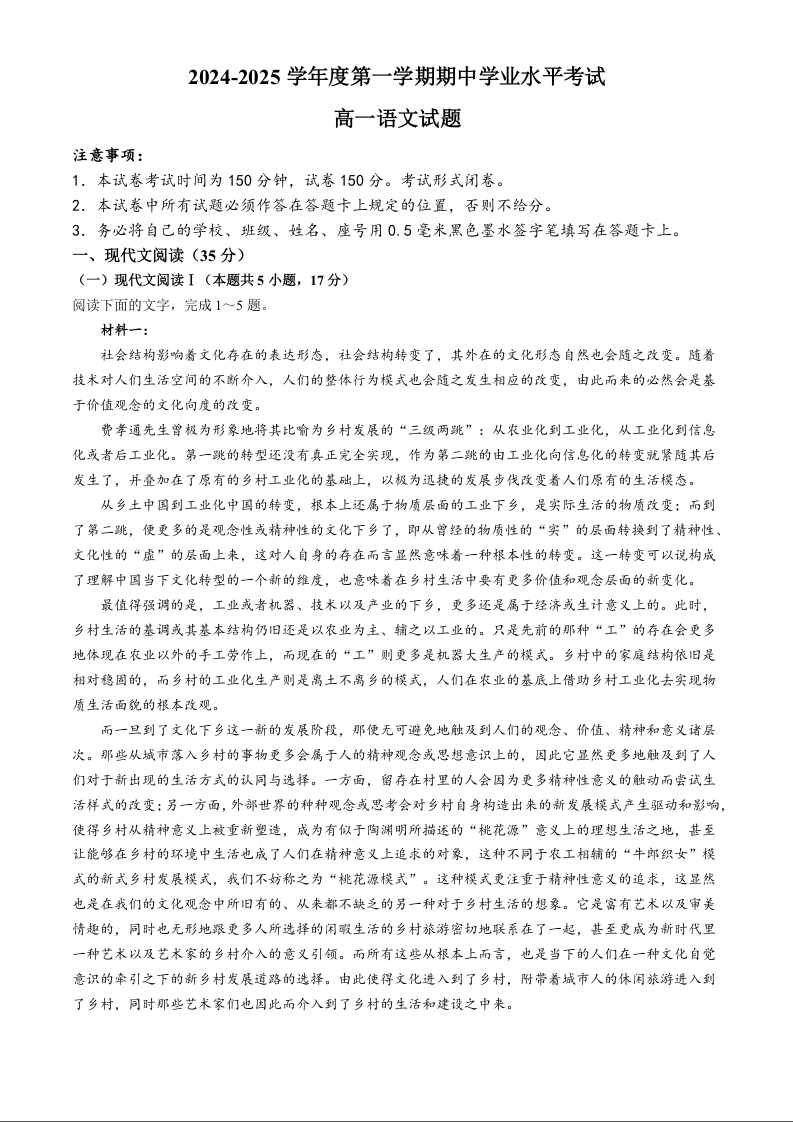 江苏省盐城市东台市2024-2025学年高一上学期期中学业水平考试语文