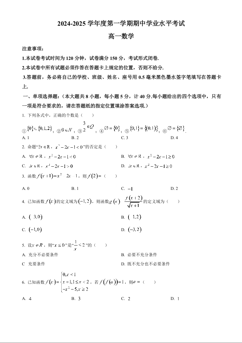 江苏省盐城市东台市2024-2025学年高一上学期期中学业水平考试数学(原卷版)