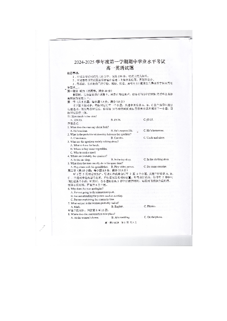 江苏省盐城市东台市2024-2025学年高一上学期期中学业水平考试英语