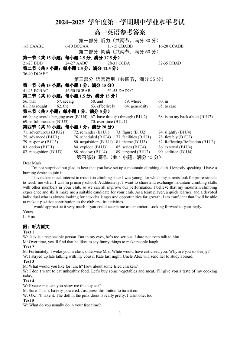 江苏省盐城市东台市2024-2025学年高一上学期期中学业水平考试英语答案