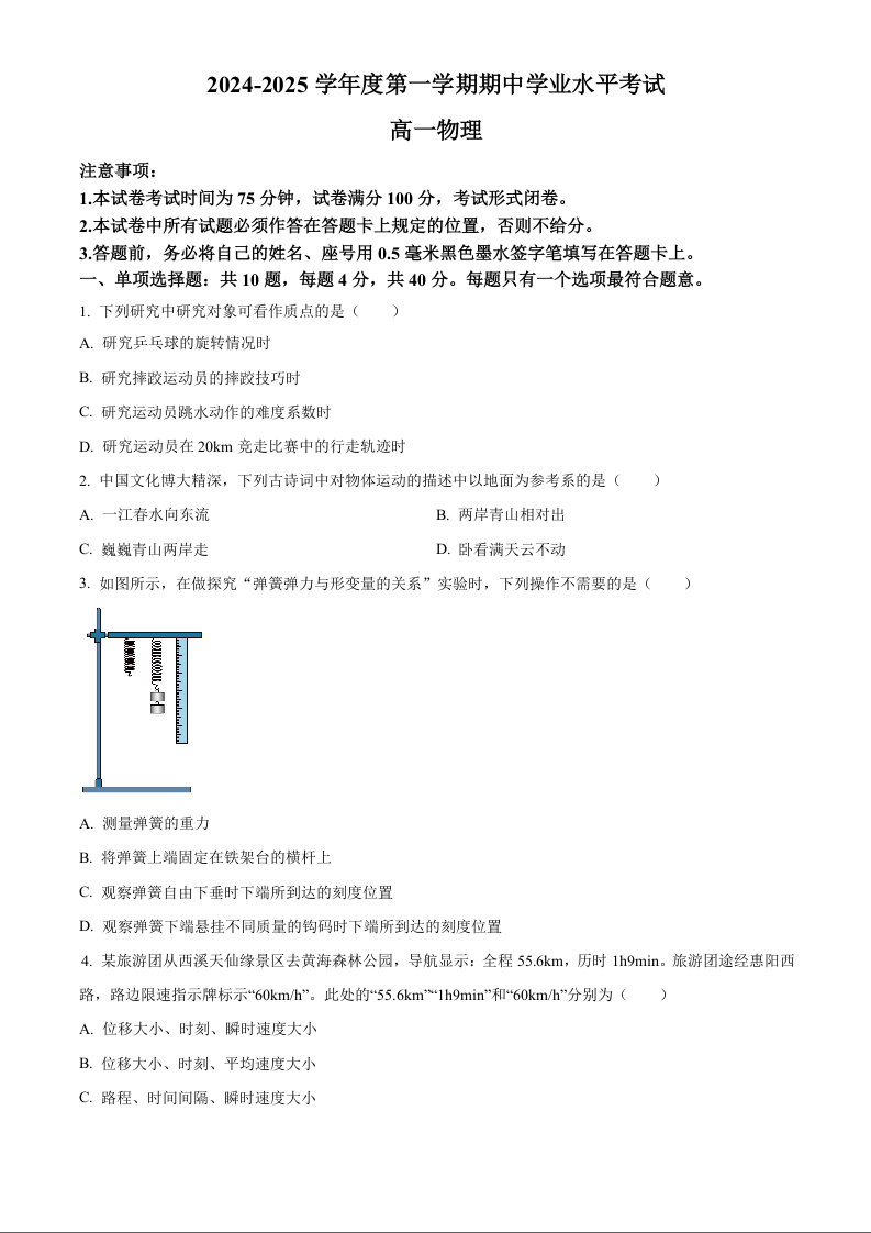 江苏省盐城市东台市2024-2025学年高一上学期期中学业水平考试物理(原卷版)