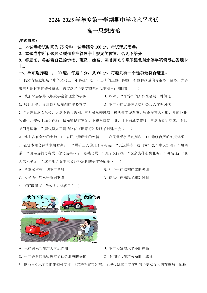 江苏省盐城市东台市2024-2025学年高一上学期期中学业水平考试政治(原卷版)
