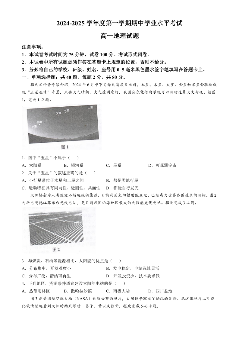 江苏省盐城市东台市2024-2025学年高一上学期期中学业水平考试地理
