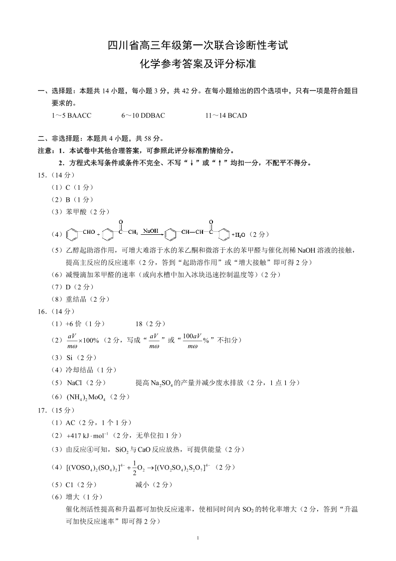 四川省成都市区域名校2025届高三上学期第一次联合性诊断性考试化学答案
