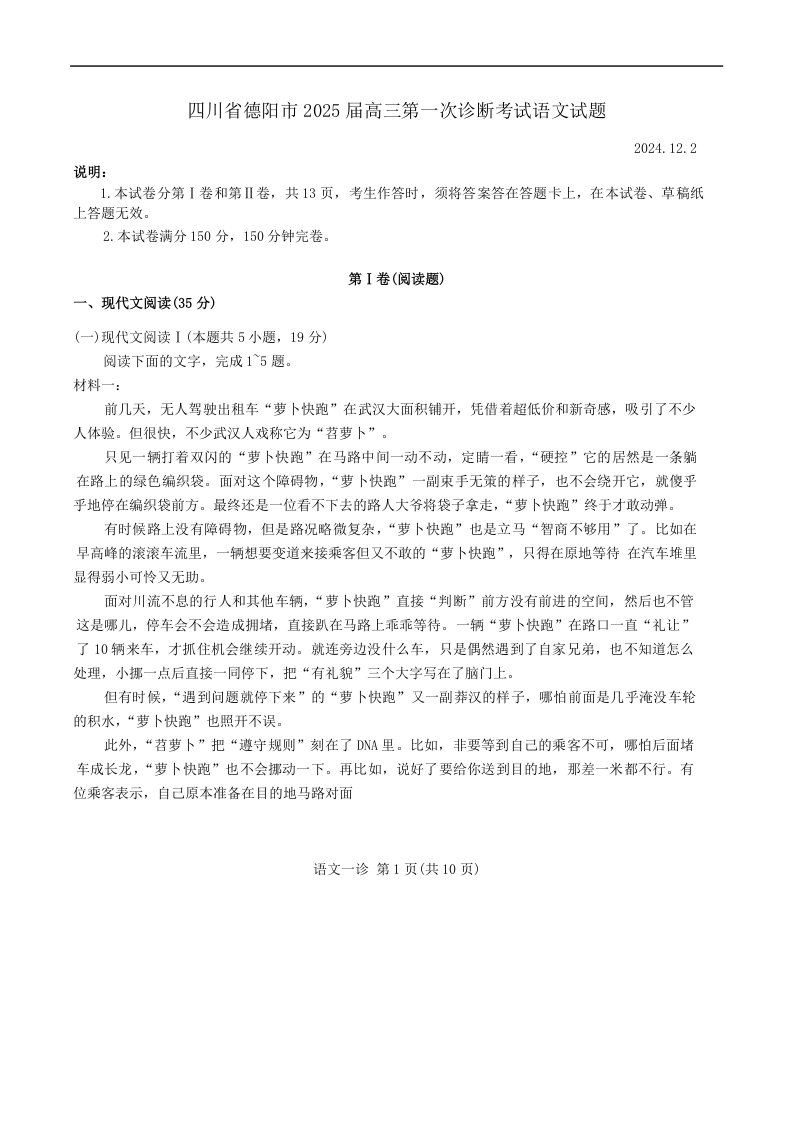 四川省德阳市高中2022级第一次诊断考试语文Word版含答案