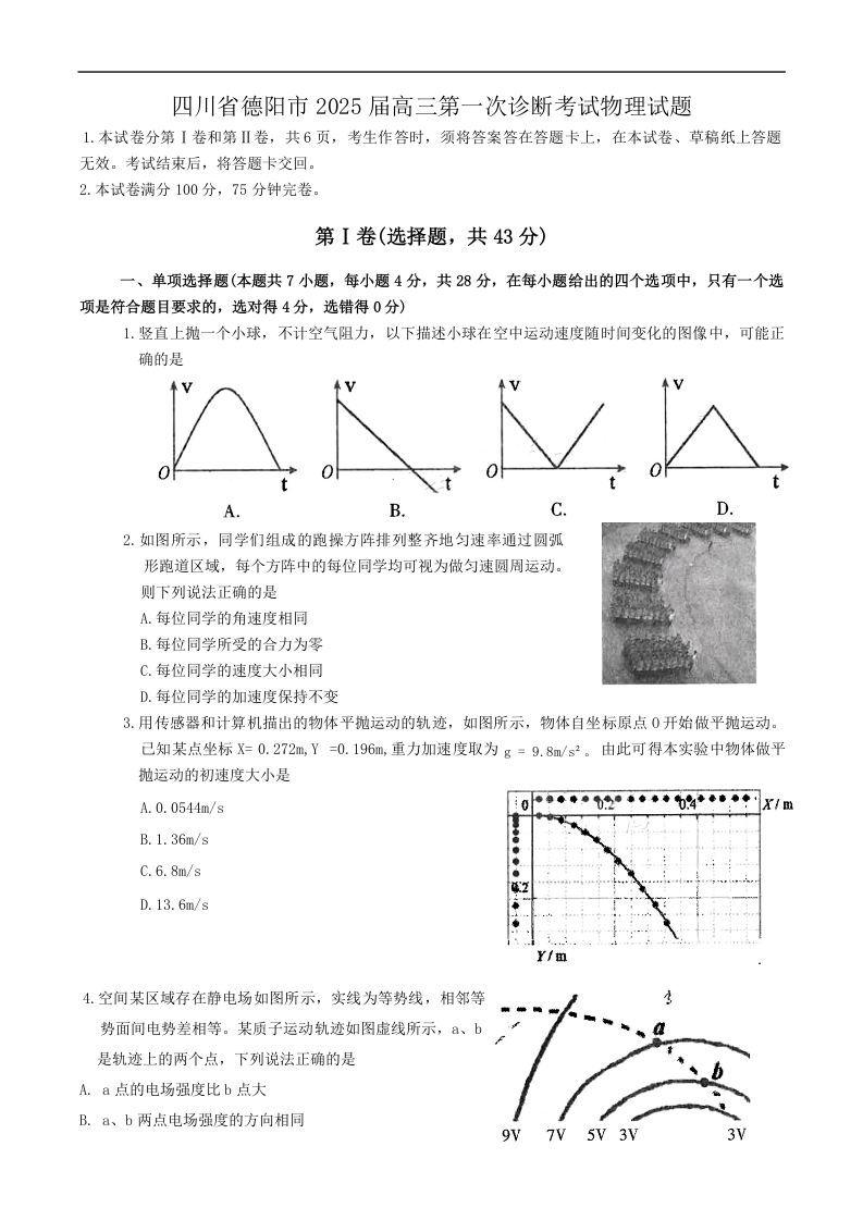 四川省德阳市高中2022级第一次诊断考试物理Word版含答案
