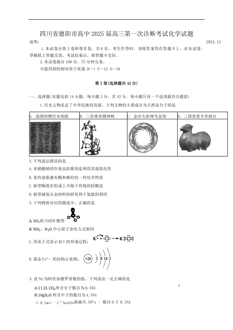 四川省德阳市高中2022级第一次诊断考试化学Word版含答案
