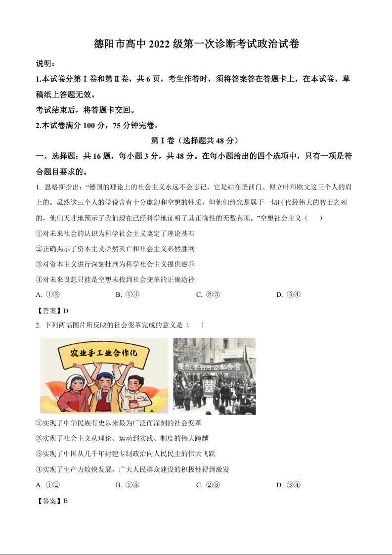 四川省德阳市高中2022级第一次诊断考试政治Word版含答案