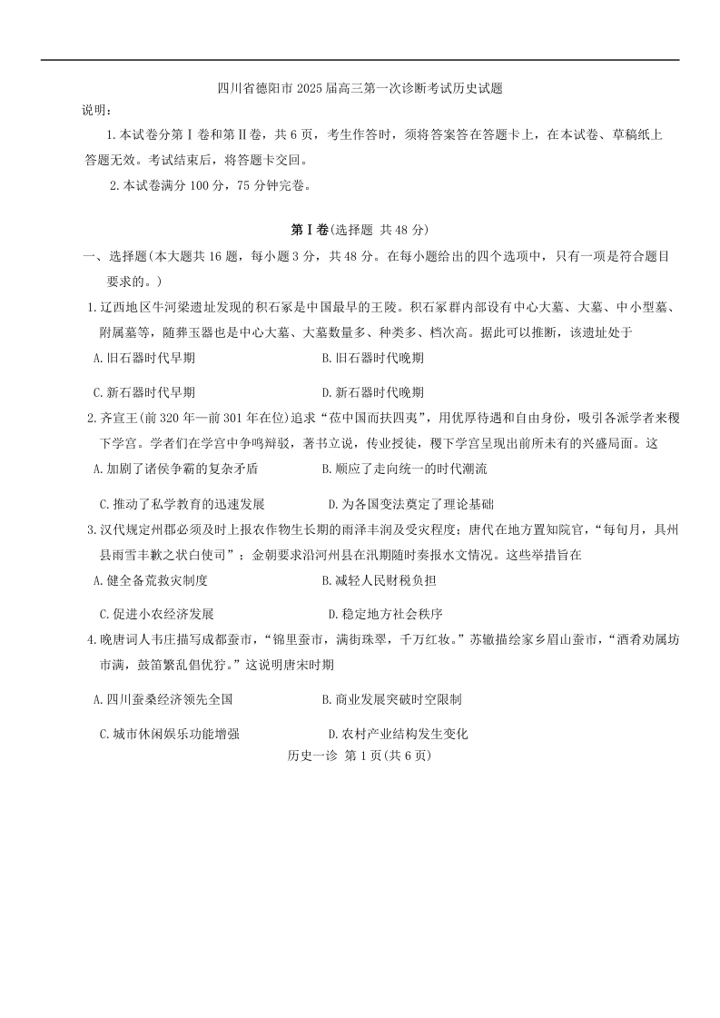 四川省德阳市高中2022级第一次诊断考试历史Word版含答案