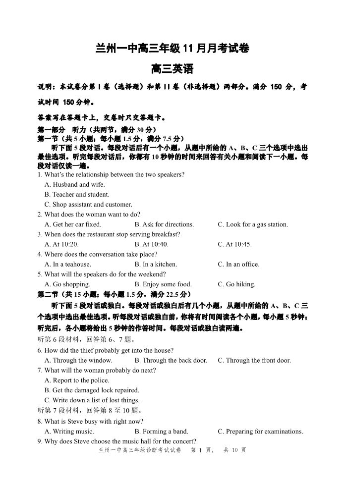 甘肃省兰州市第一中学2025届高三上学期11月月考英语