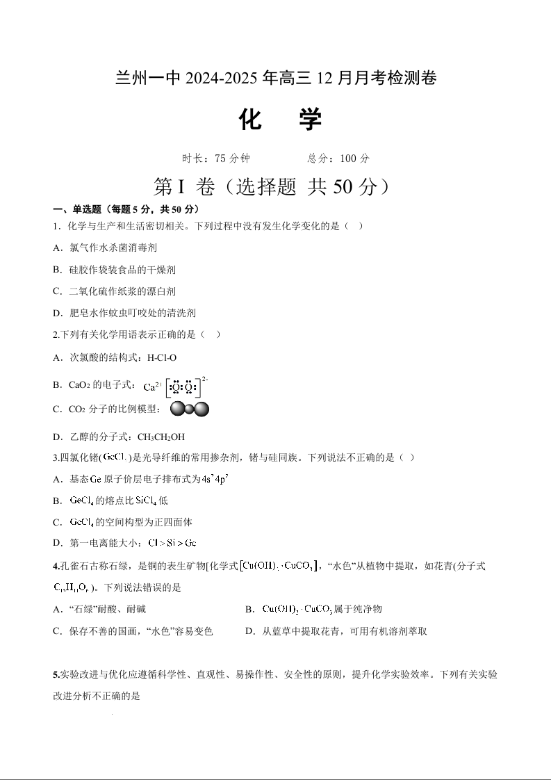 甘肃省兰州市第一中学2025届高三上学期12月月考化学