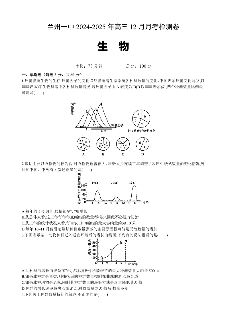 甘肃省兰州市第一中学2025届高三上学期12月月考生物Word版原卷