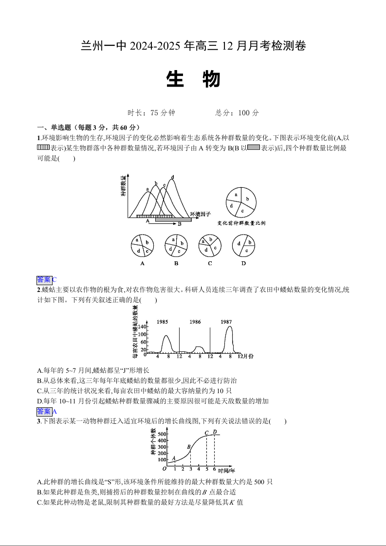 甘肃省兰州市第一中学2025届高三上学期12月月考生物Word版含答案