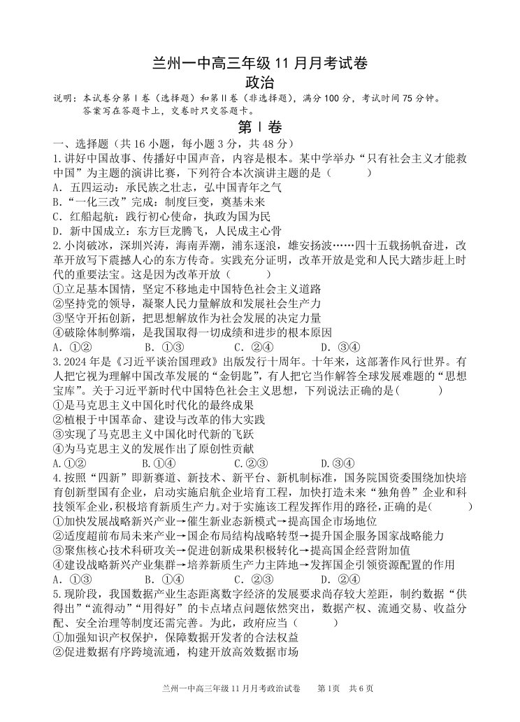 甘肃省兰州市第一中学2025届高三上学期12月月考政治