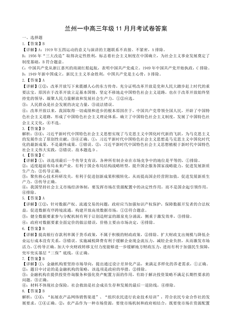 甘肃省兰州市第一中学2025届高三上学期12月月考政治答案
