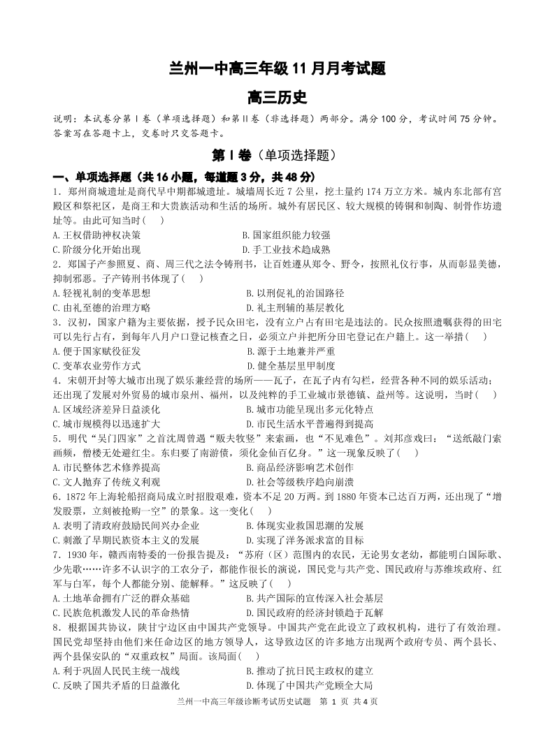 甘肃省兰州市第一中学2025届高三上学期11月月考历史