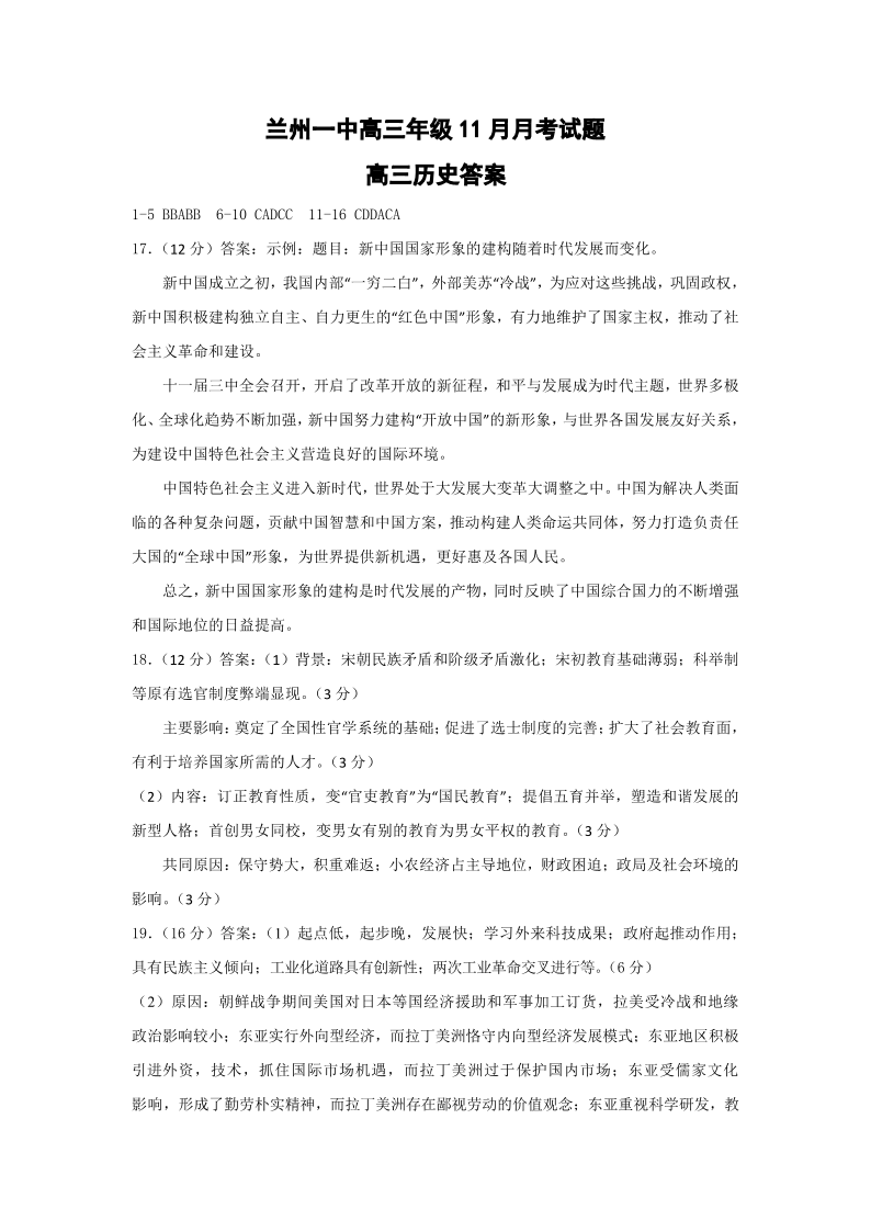 甘肃省兰州市第一中学2025届高三上学期11月月考历史答案
