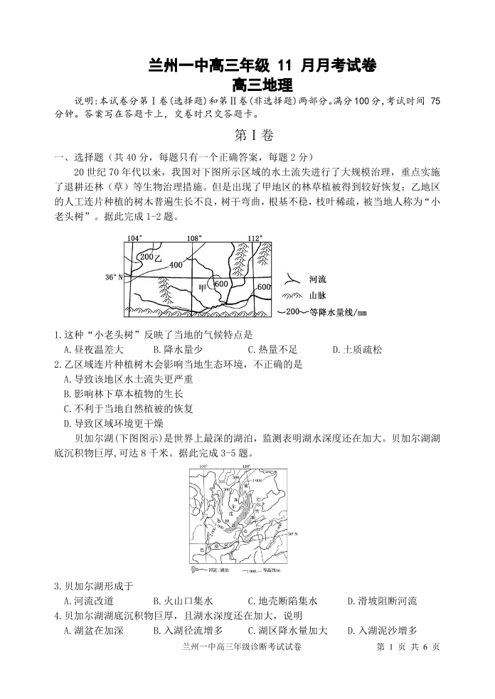 甘肃省兰州市第一中学2025届高三上学期11月月考地理