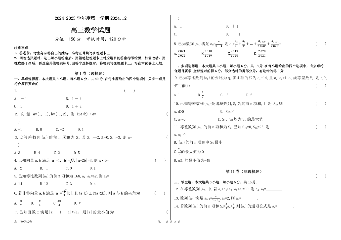 黑龙江省佳木斯市第八中学2025届高三上学期12月月考数学