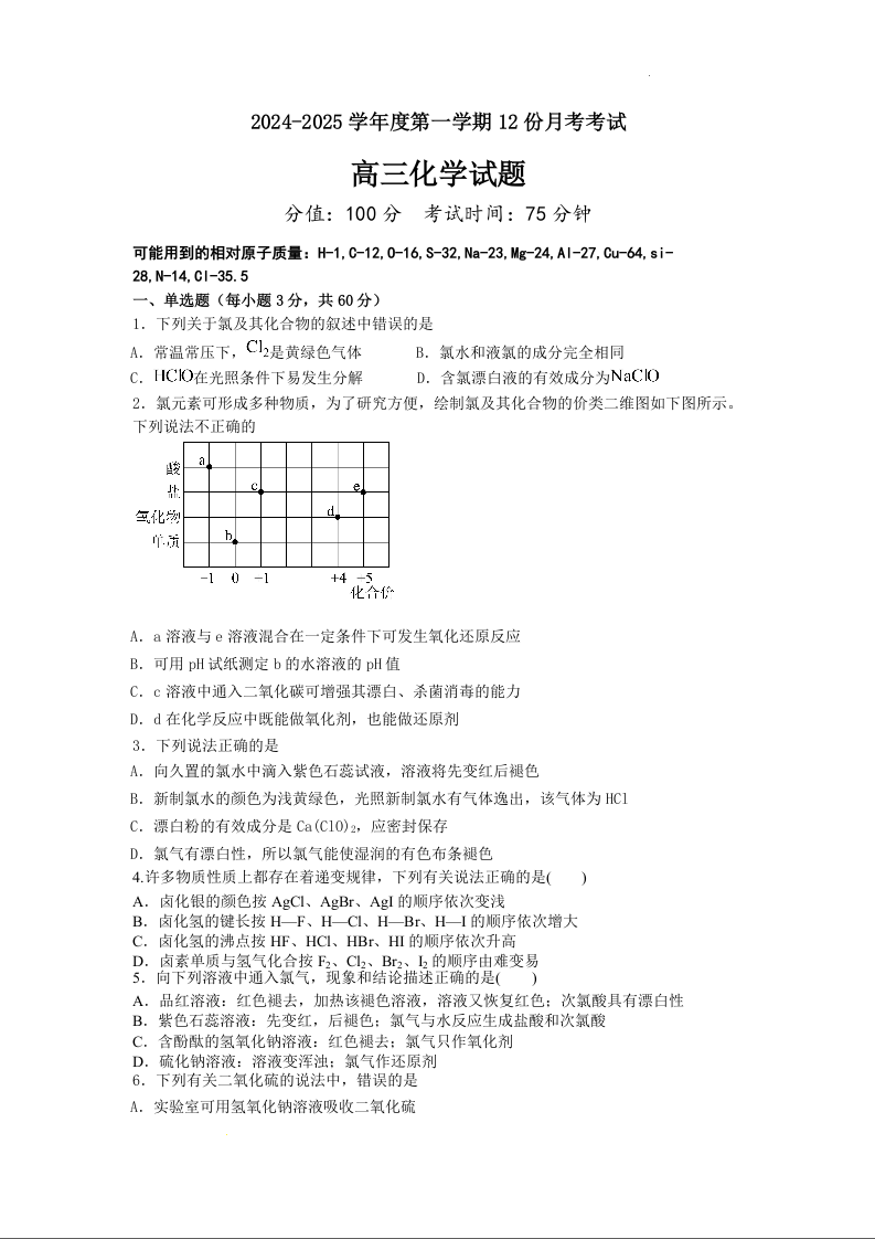 黑龙江省佳木斯市第八中学2025届高三上学期12月月考化学