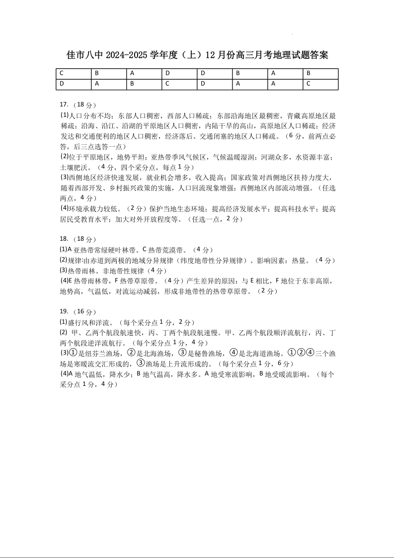黑龙江省佳木斯市第八中学2025届高三上学期12月月考地理答案