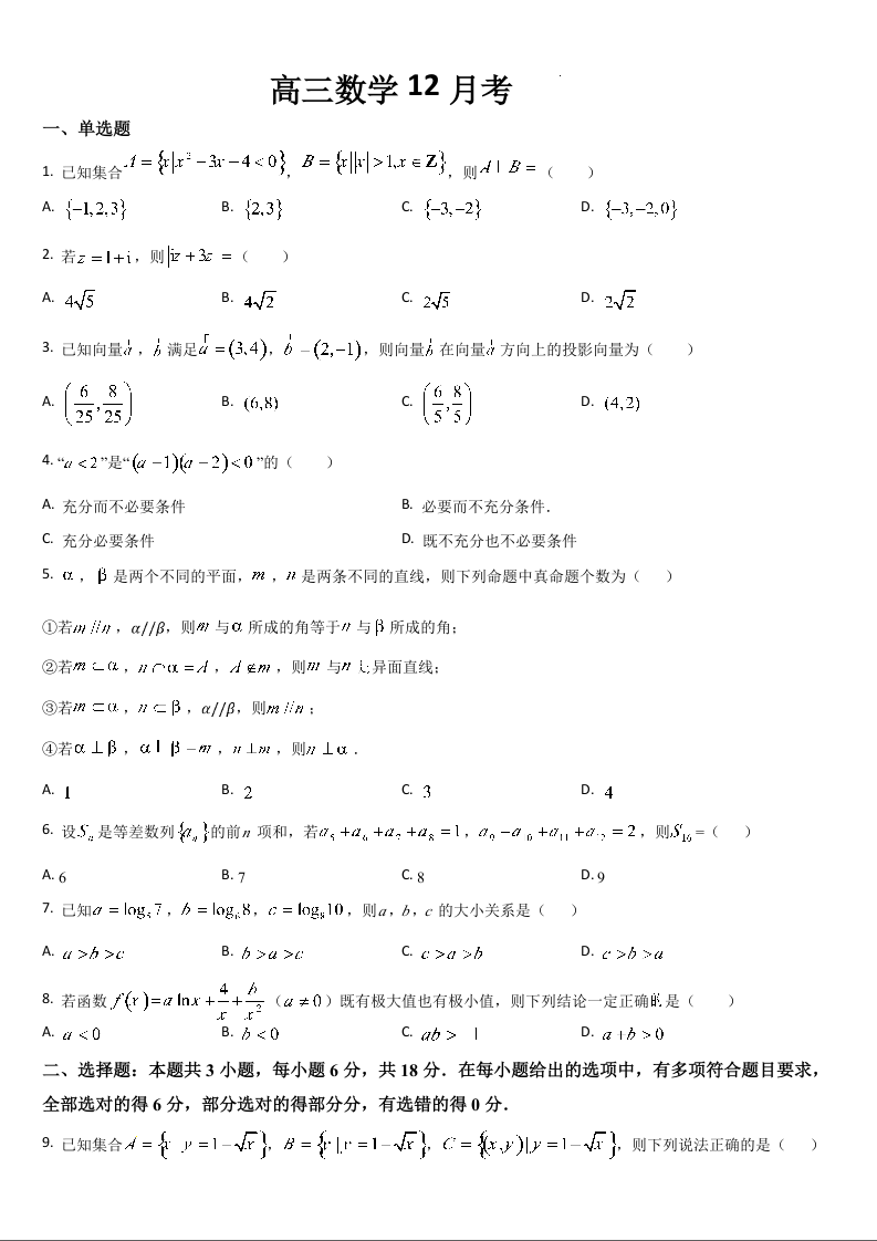 吉林省通化市区域高中2025届高三上学期12月月考数学Word版含答案