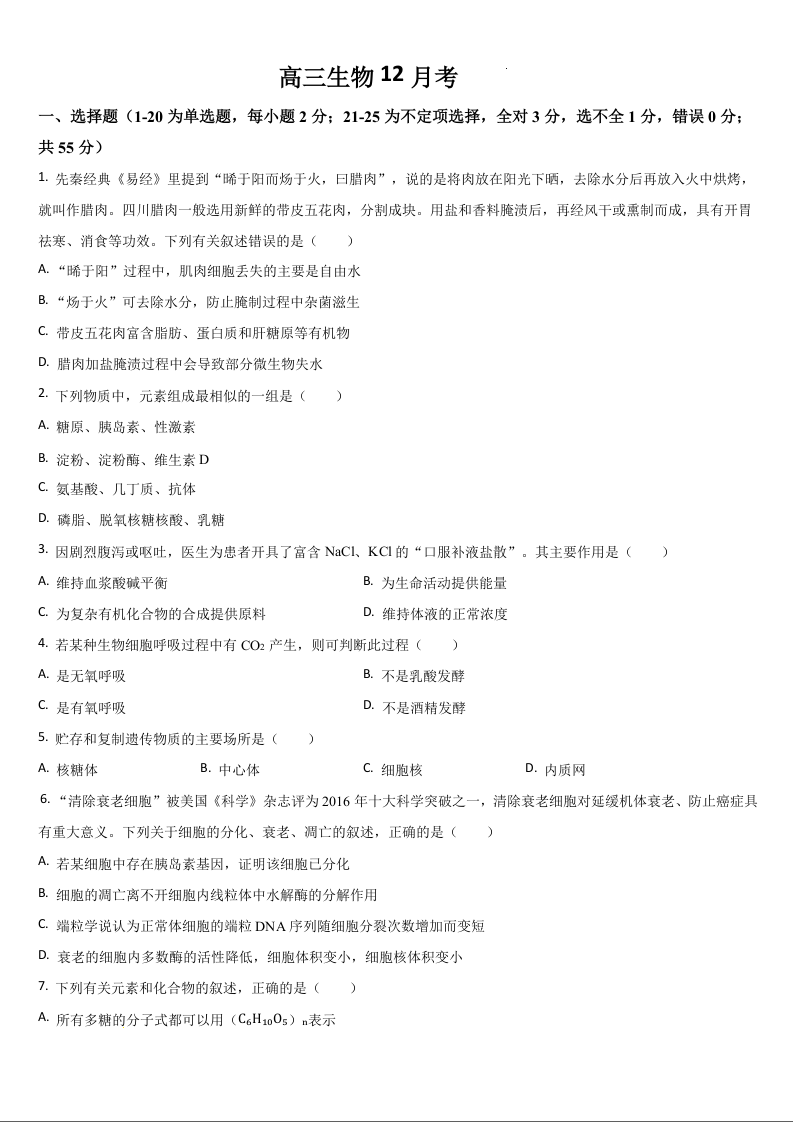 吉林省通化市区域高中2025届高三上学期12月月考生物Word版含答案