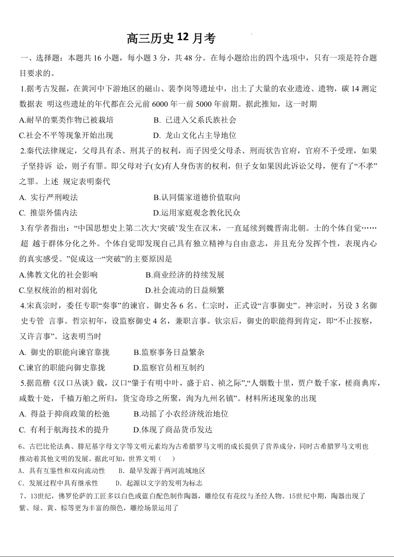 吉林省通化市区域高中2025届高三上学期12月月考历史Word版含答案