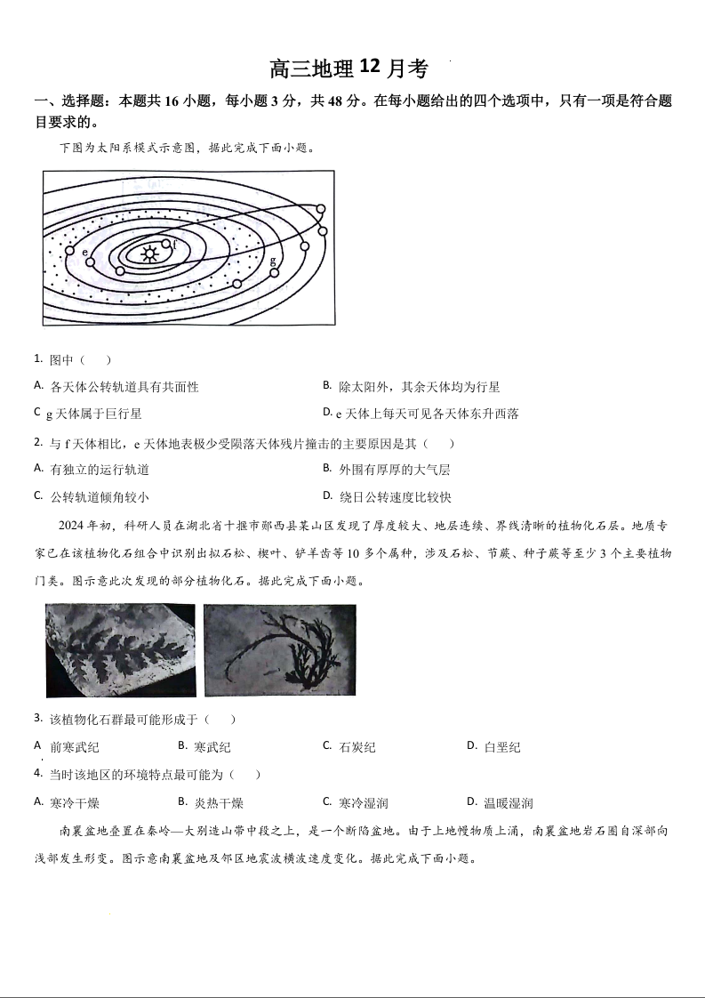 吉林省通化市区域高中2025届高三上学期12月月考地理Word版含答案