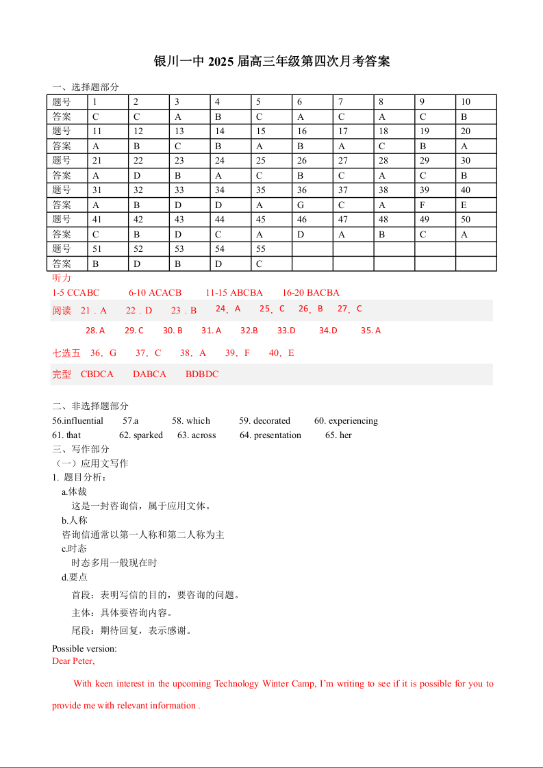 宁夏回族自治区银川一中2025届高三上学期第四次月考英语答案