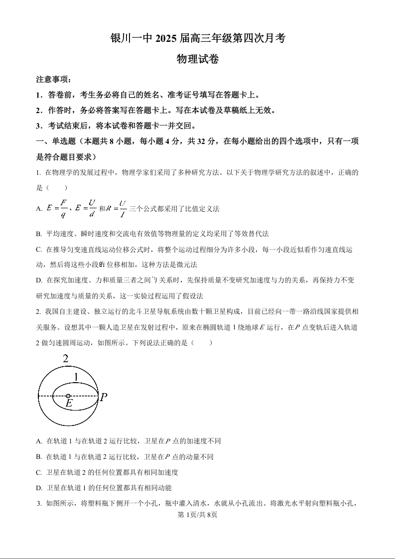 宁夏回族自治区银川一中2025届高三上学期第四次月考物理(原卷版)