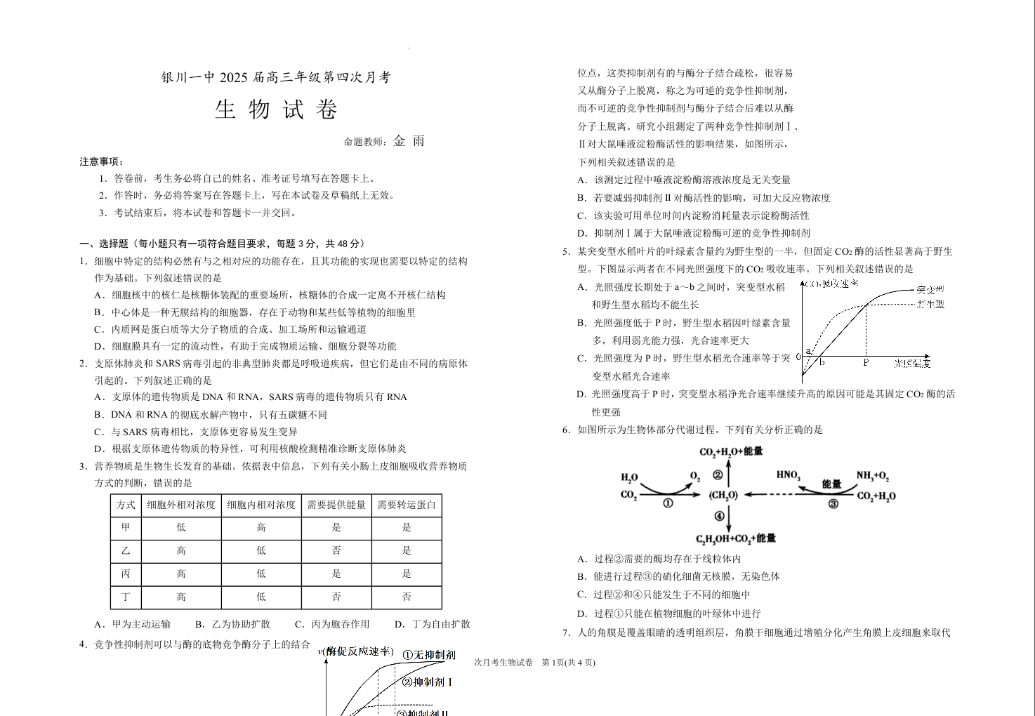 宁夏回族自治区银川一中2025届高三上学期第四次月考生物