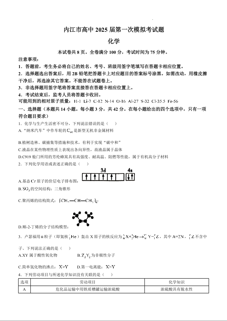 四川省内江市高中2025届第一次模拟考试化学