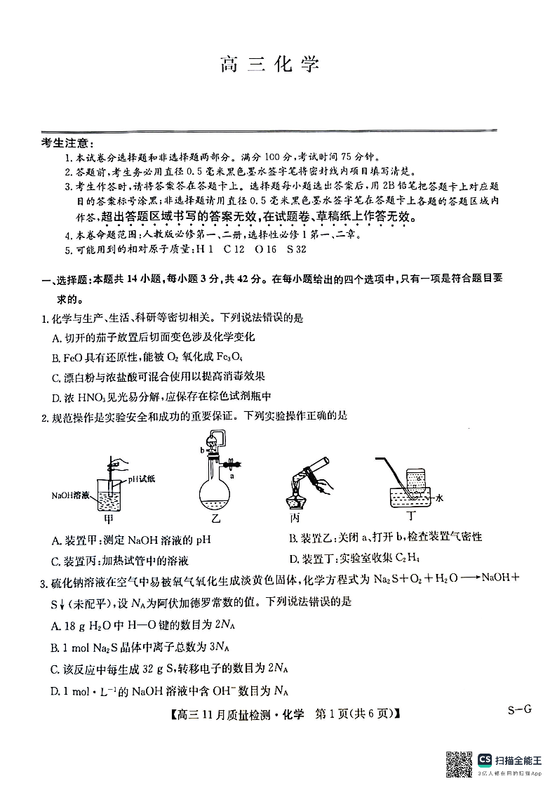 河南省许平汝名校2024-2025学年高三上学期12月月考化学