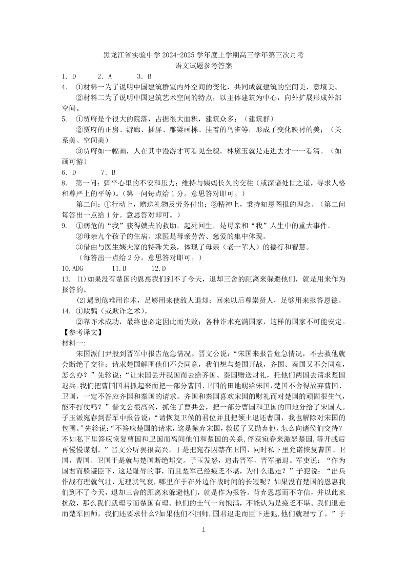 黑龙江省实验中学2024-2025学年度高三上学期第三次月考语文答案