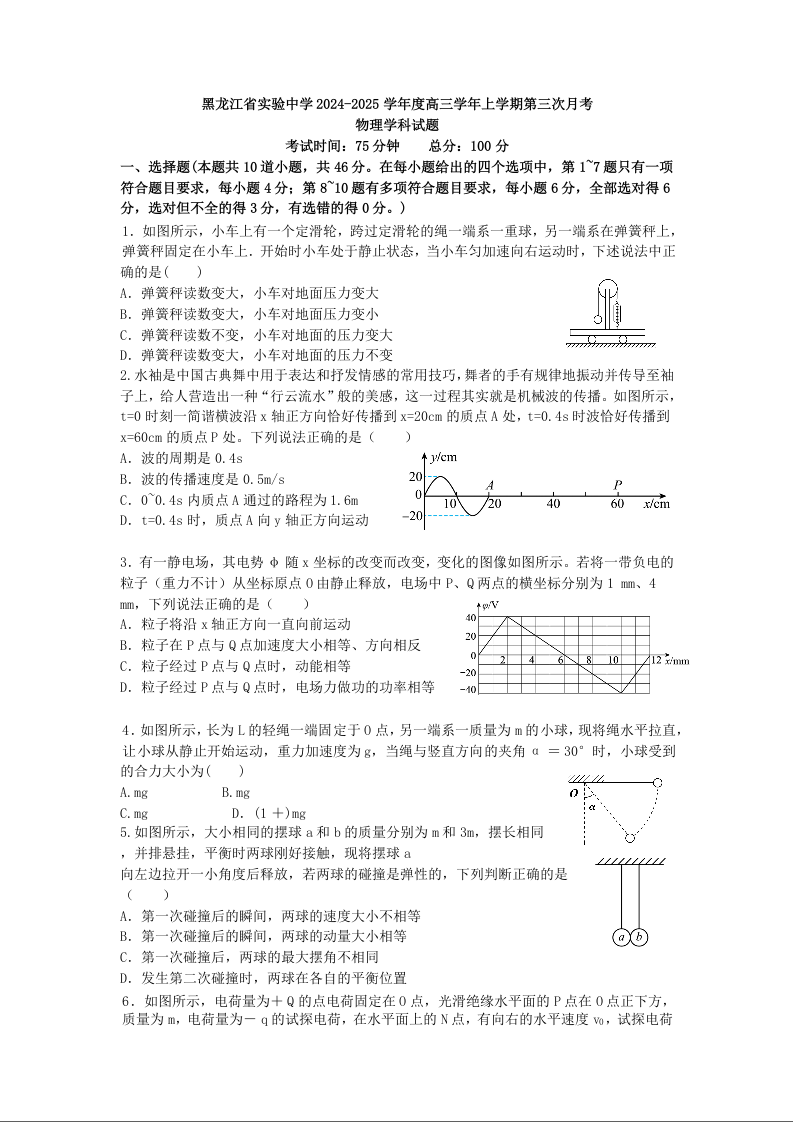 黑龙江省实验中学2024-2025学年度高三上学期第三次月考物理