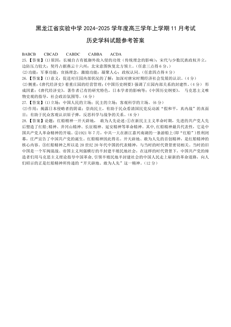 黑龙江省实验中学2024-2025学年度高三上学期第三次月考历史答案