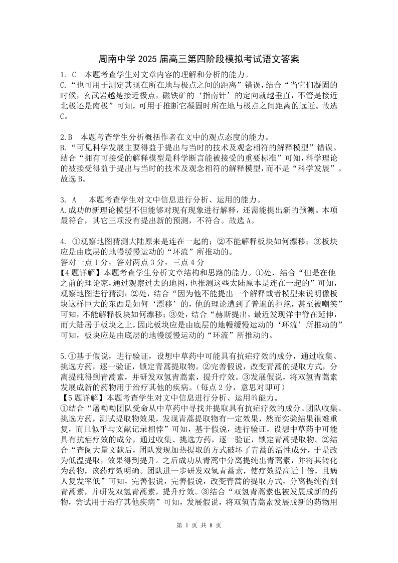 湖南省长沙市周南中学2025届高三上学期第四阶段模拟考试语文答案
