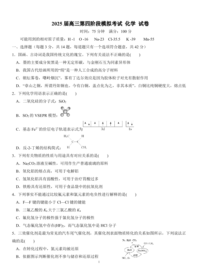 湖南省长沙市周南中学2025届高三上学期第四阶段模拟考试化学
