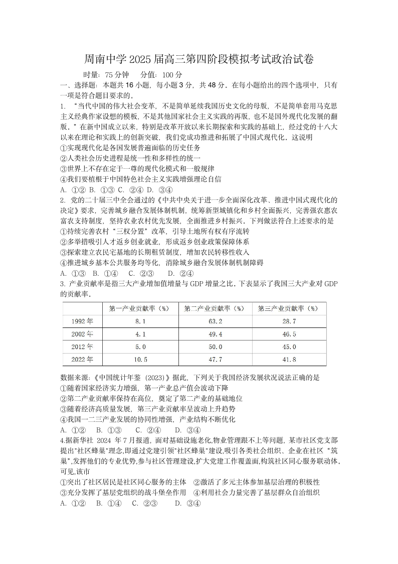 湖南省长沙市周南中学2025届高三上学期第四阶段模拟考试政治