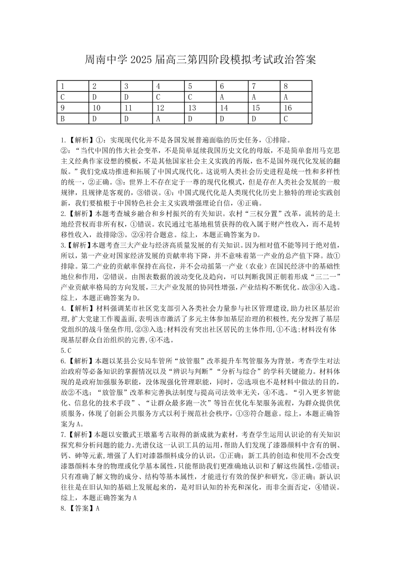 湖南省长沙市周南中学2025届高三上学期第四阶段模拟考试政治答案