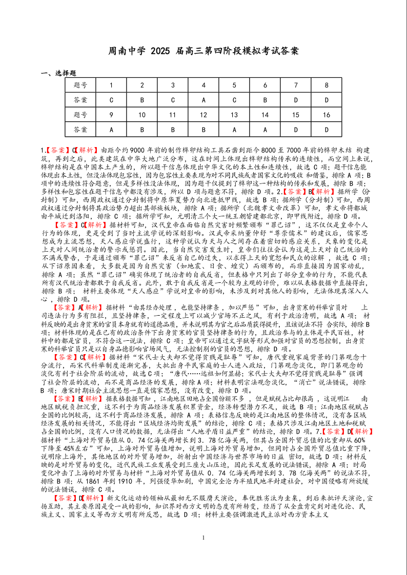 湖南省长沙市周南中学2025届高三上学期第四阶段模拟考试历史答案