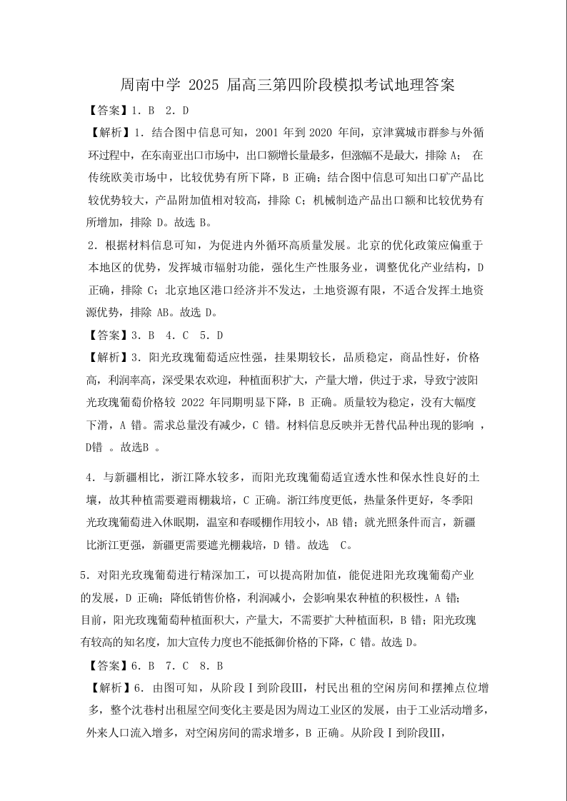湖南省长沙市周南中学2025届高三上学期第四阶段模拟考试地理答案