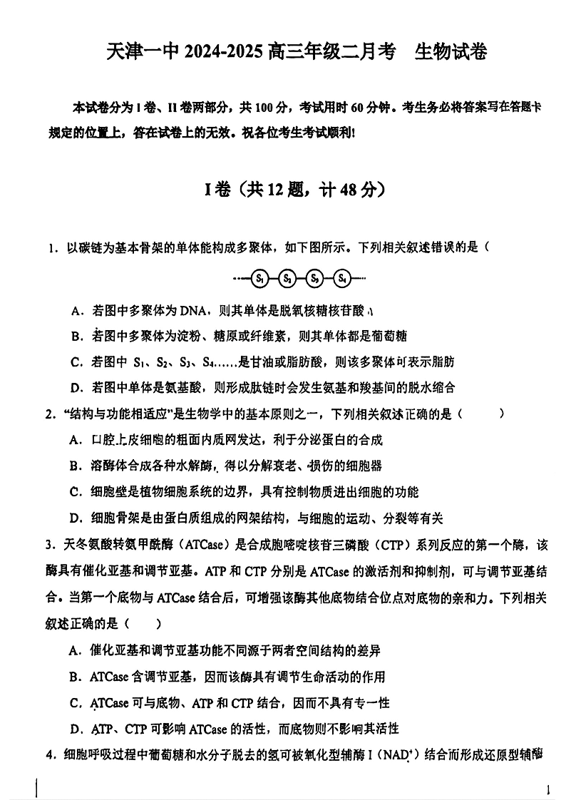 天津市第一中学2024-2025学年高三上学期第二次月考生物