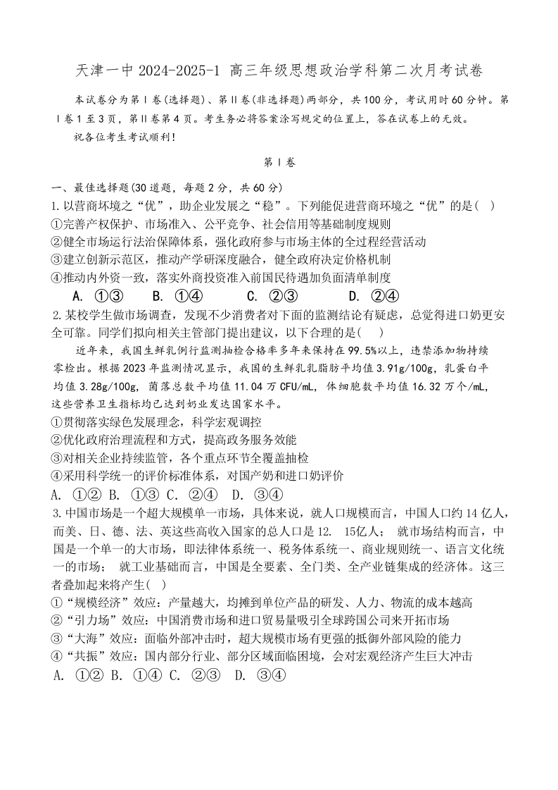 天津市第一中学2024-2025学年高三上学期第二次月考政治